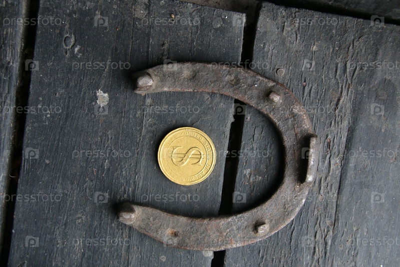 Ключ к финансовой концепции удачи. Старинный фон. Подкова и золотой доллар
