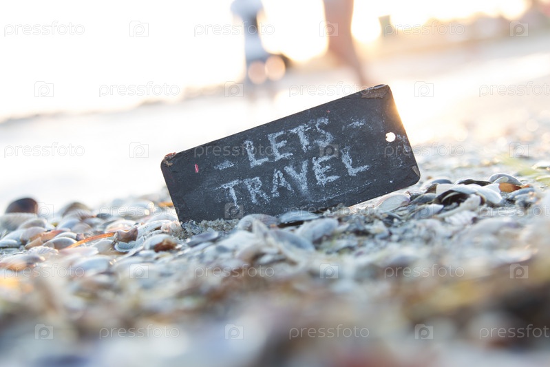 Давай путешествовать. Идея летней поездки. Тарелка с надписью на красивом пляже