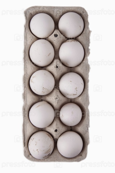 Коробка белых куриных яиц, изолированные на белом фоне. Вид сверху, 10 шт