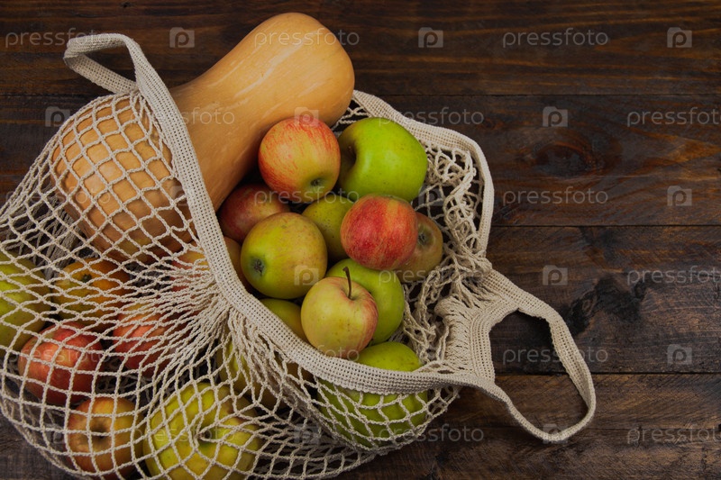 Плоская композиция с эко-сумкой для покупок. Яблоки, тыква в сетке. Экологичная, безотходная, без пластика, многоразовая концепция