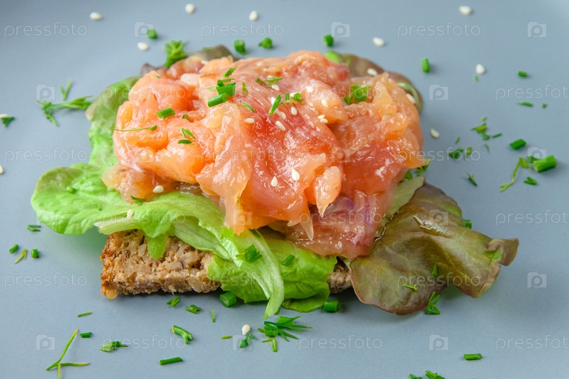 Открытый бутерброд с лососем и салатом из красной рыбы
