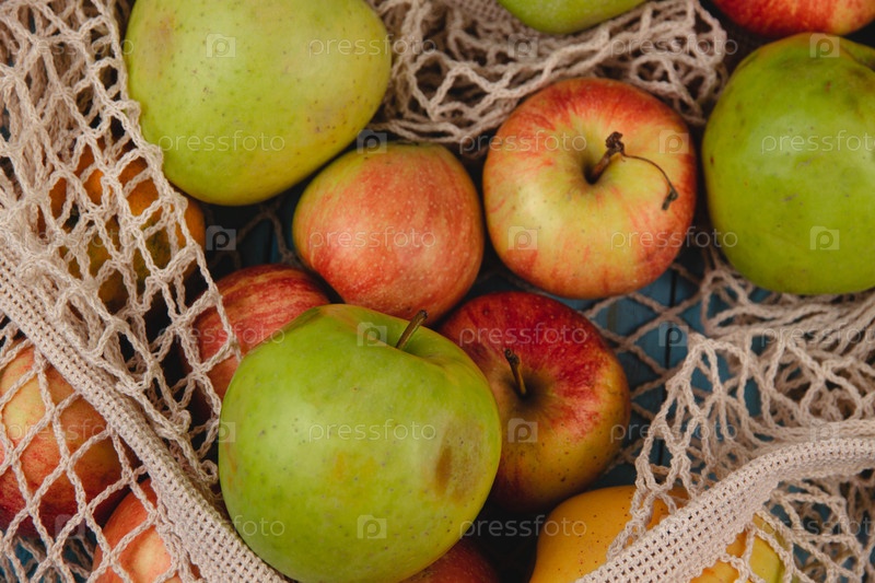 Вид сверху на органические яблоки в экологически чистой сетчатой сумке для покупок на синей деревенской доске. Без отходов, без пластика, экологически чистая, многоразовая концепция