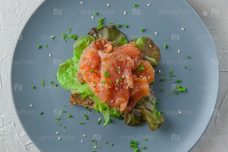 Сэндвич с цельнозерновым хлебом, лососем и салатом на серой тарелке