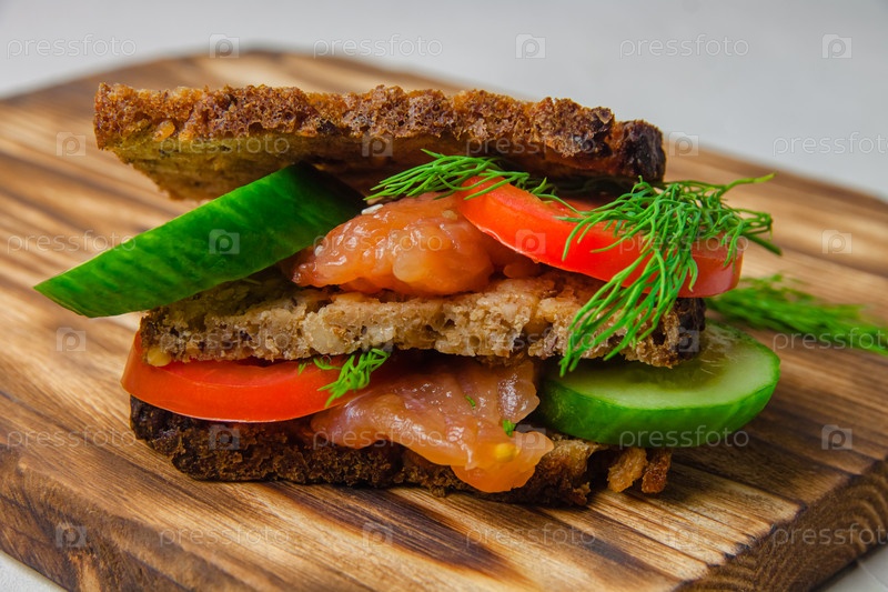 Сэндвич с красным рыбным хлебом с огурцом, зеленью и помидорами на деревенской доске