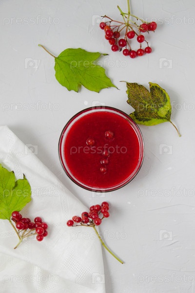 Варенье из калины в стеклянной миске на светло-сером фоне, украшенное ветвями калины, листьями и белым полотенцем. Осенняя композиция вид сверху