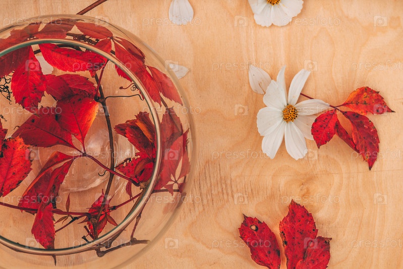 Стеклянная ваза с красными листьями внутри на деревянном коричневом столе