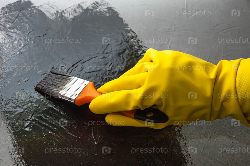 Рука с кистью в желтой резиновой перчатке, краски черной краской