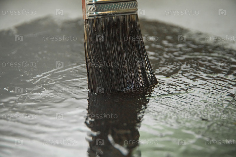 Кисть крупным планом красит бетонную поверхность черной масляной краской