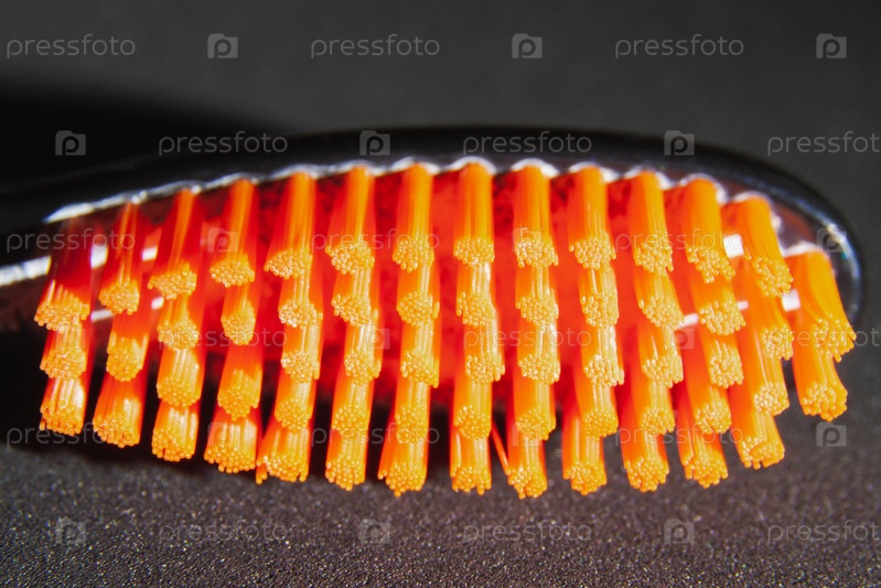 Черная зубная щетка с оранжевой щетиной крупным планом