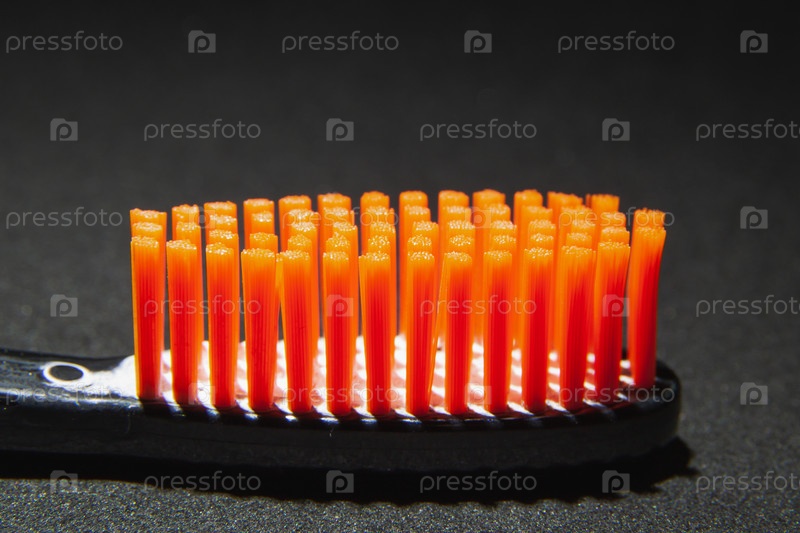 Черная зубная щетка с оранжевой щетиной крупным планом