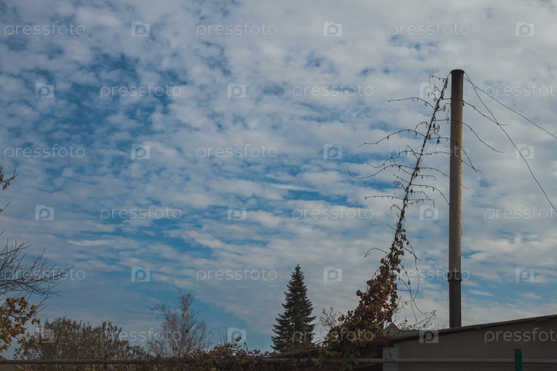Дымоход с веточкой хмеля на фоне неба с облаками