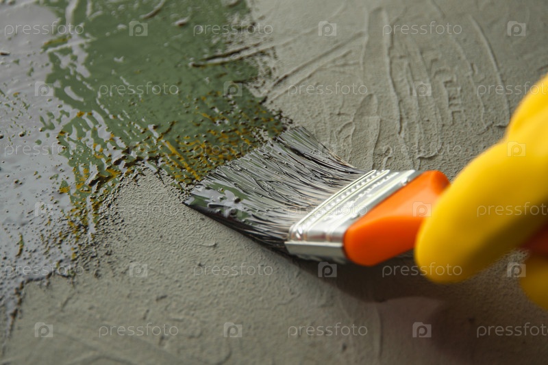 Рука в желтой перчатке красит бетонную поверхность черной масляной краской