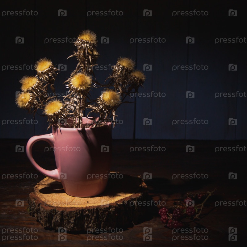 Осенняя композиция с сушеными шипами в розовой чашке на деревянном пне с веткой ежевики