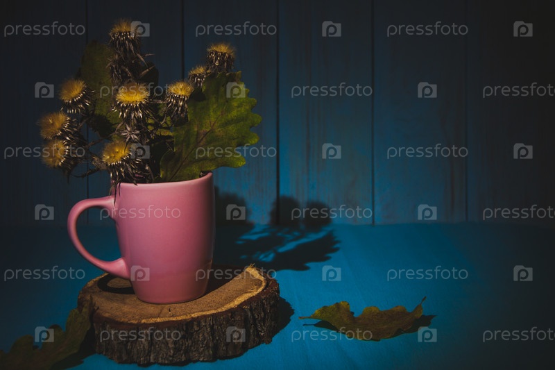 Осенняя композиция с сушеными шипами в розовой чашке на деревянном пне с осенними листьями