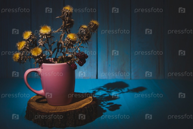 Осенняя композиция с сушеными шипами в розовой чашке на деревянном пне с осенними листьями