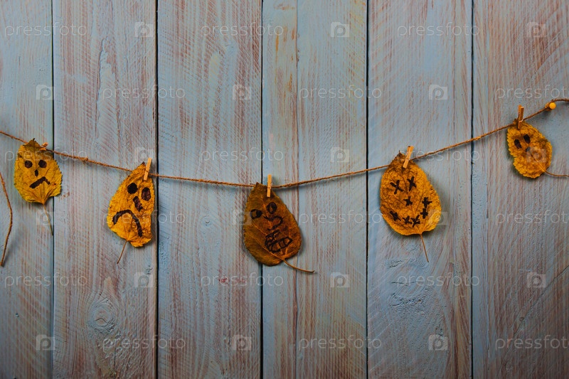 Забавный смайлик смайлик, нарисованный на золотых осенних листьях, висящих на веревке на синем деревенском деревянном фоне. Копипространство
