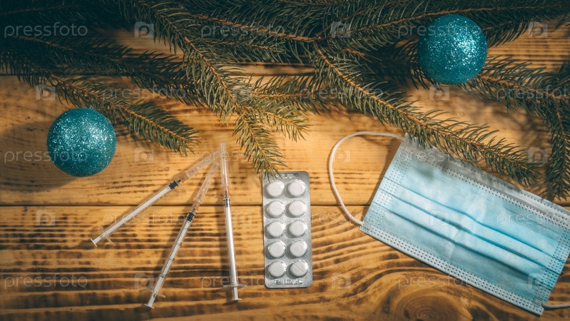 Плоская укладка медицинской маски, шприца, таблеток в блистерной упаковке и синих блестящих новогодних шаров, лежащих на старой коричневой деревянной доске с сосновыми ветвями сверху
