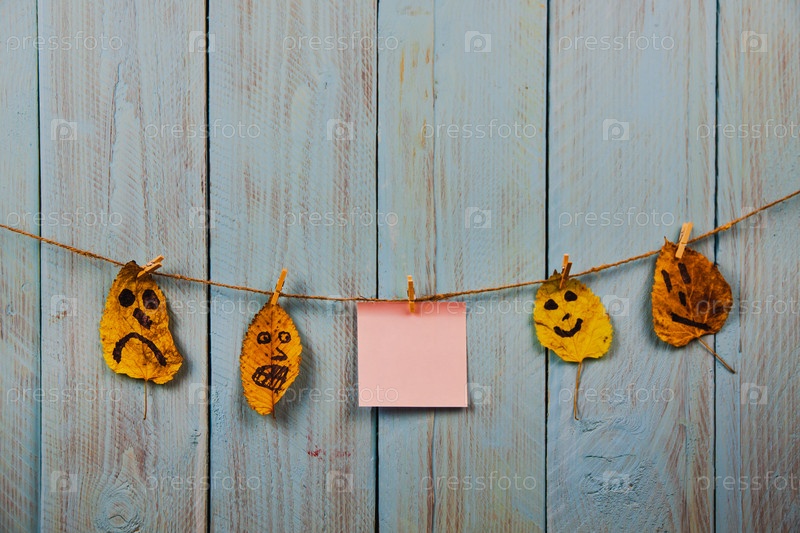 Розовые бумаги для заметок и смешные лица на осенних листьях, висящих на веревке на синем деревенском деревянном фоне. Копипространство. Концепция сообщений-памяток