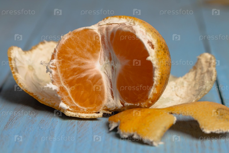 Очищенный полусвежий спелый мандарин на синем деревянном фоне