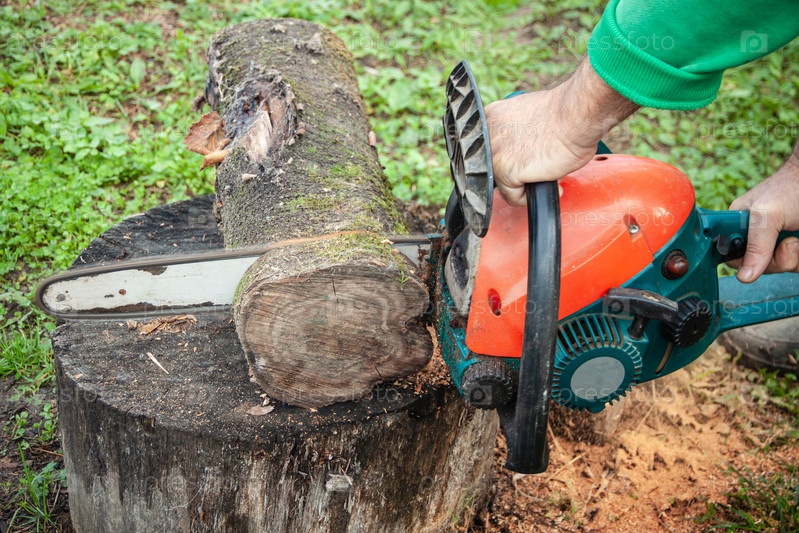 Мужчина распиливает ствол дерева бензопилой. Концепция садоводства, садовник, резка дерева