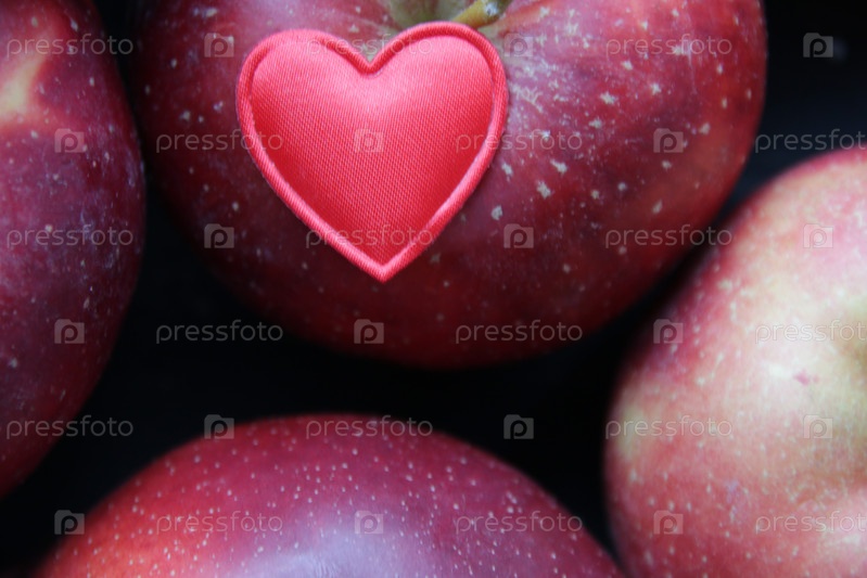 Красное сердце на спелых красных яблоках, концепция здорового питания