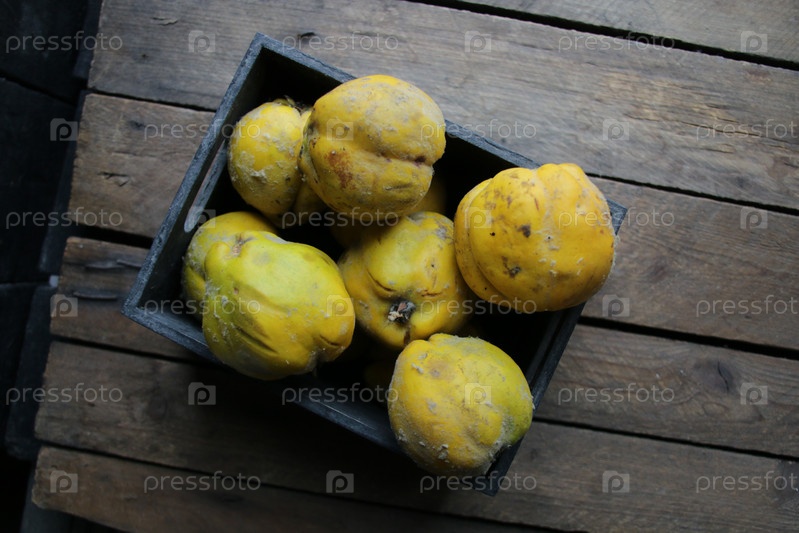 Спелая айва в коробке на деревянном столе