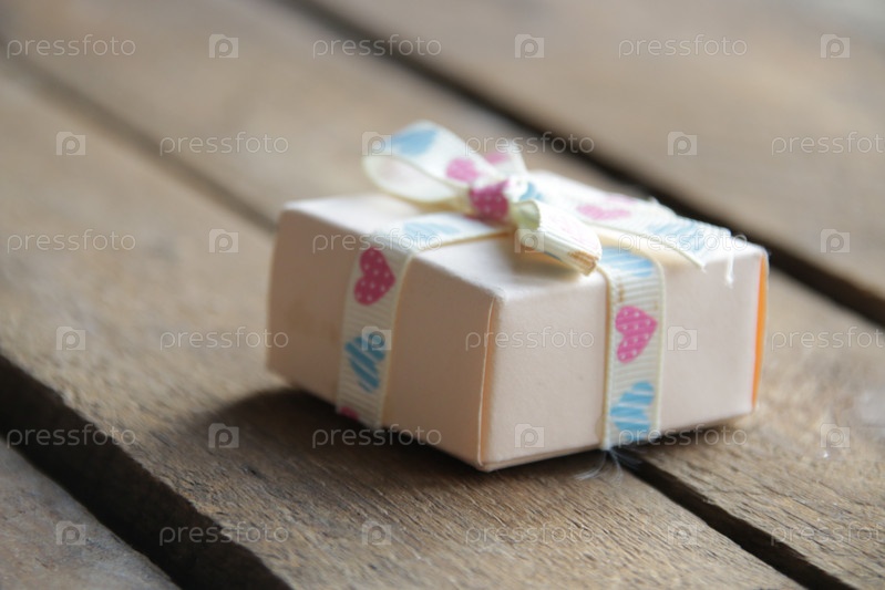 Подарок с лентой на красивом деревянном фоне