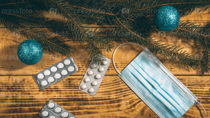Плоская укладка медицинской маски, три блистера с таблетками и блестящие рождественские и новогодние украшения, лежащие на деревенском деревянном фоне с сосной сбоку