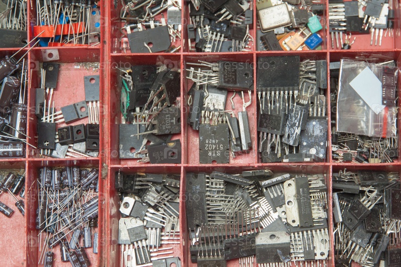 Коробка с деталями для ремонта телевизоров и другой электроники