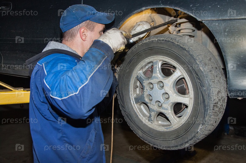 Механик с фонариком и ломом осматривает переднюю подвеску автомобиля