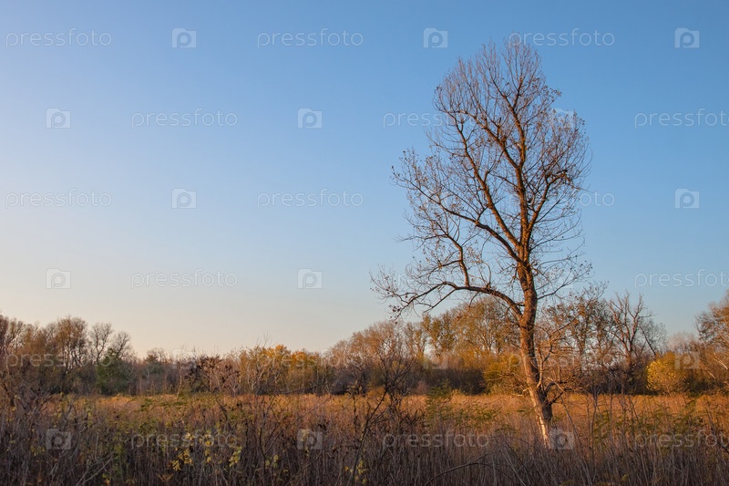 Осенний пейзаж. Одинокое безлистное дерево на фоне голубого неба