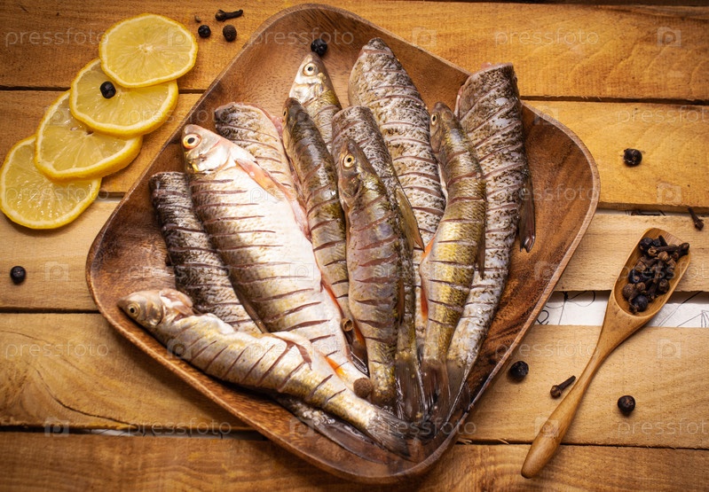 Плоский лежал свежий рыбный голавль на деревянной квадратной коричневой тарелке на деревянном фоне, украшенном лимоном и ложкой, полной специй