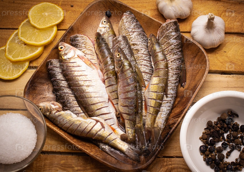 Плоский кусок свежей рыбы на деревянной квадратной коричневой тарелке на деревянном фоне, украшенный лимоном, специями, солью и чесноком