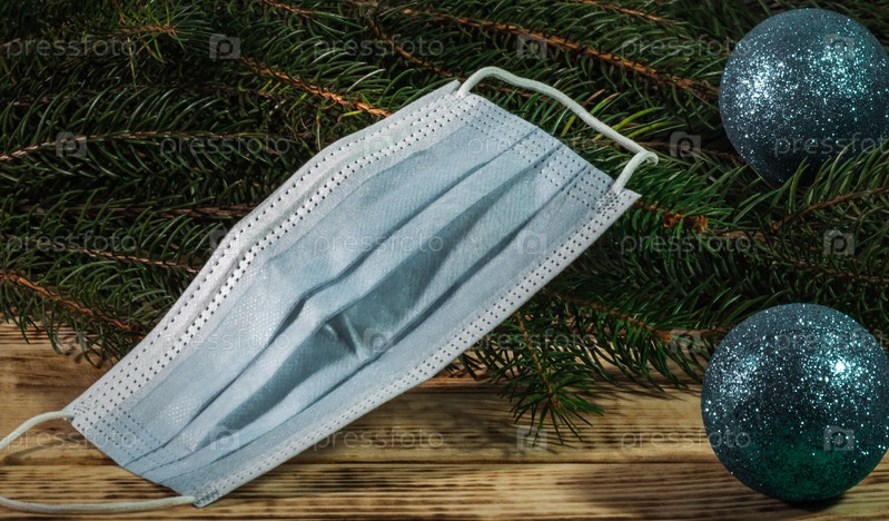 Плоское рождественское украшение и медицинская маска на деревенском деревянном фоне с сосновыми ветвями