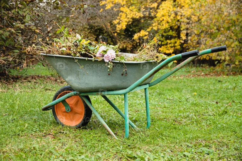тачка, заполненная листьями