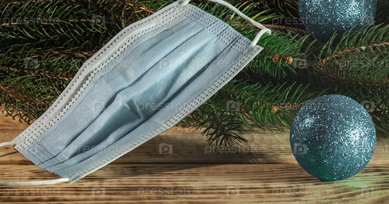 Вид сверху на рождественское украшение и медицинскую маску, лежащую на деревенском деревянном фоне с сосновыми ветвями