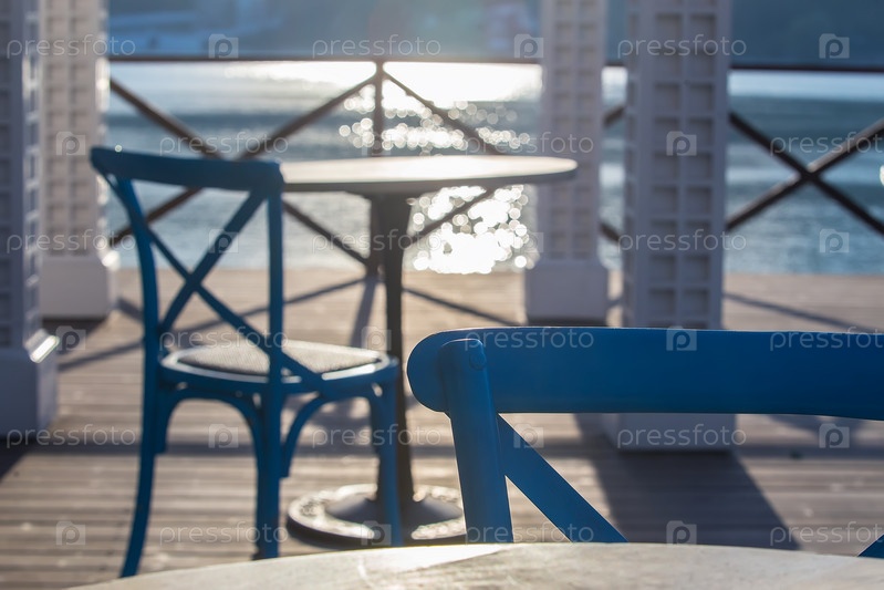 Кафе снаружи с деревянным столом и стулом у моря утром