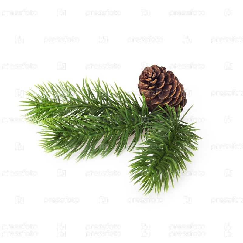 Зеленые хвойные ветки и шишки на белом фоне. Новый год и Рождество