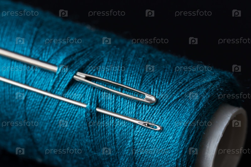 Катушка темно-синей нити и две иглы макрос