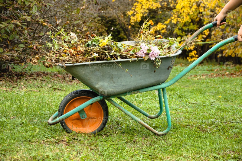 Садовая стальная прочная тачка для садового мусора. Концепция подготовки сада к зимнему сезону