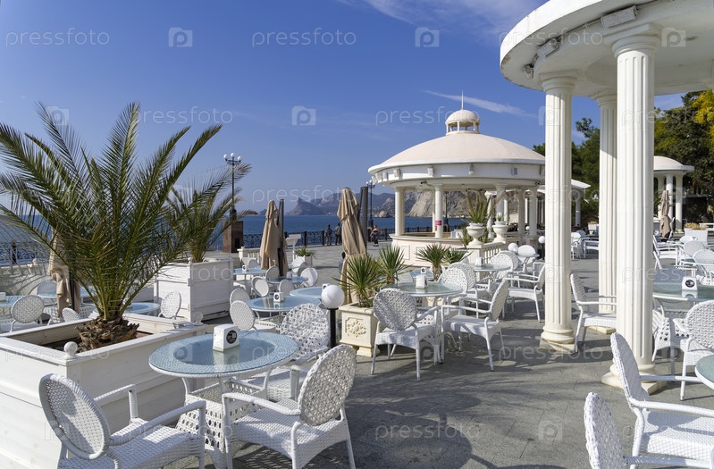 Пустое кафе на морской набережной ранним утром. Судак, Крым, солнечный день в октябре