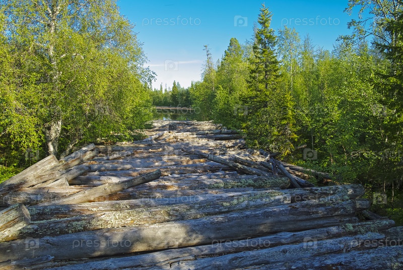 Старая заброшенная гать, использовавшаяся когда-то для лесосплава. Канозеро, река Умба, Кольский полуостров, Мурманская область. Солнечный день в августе