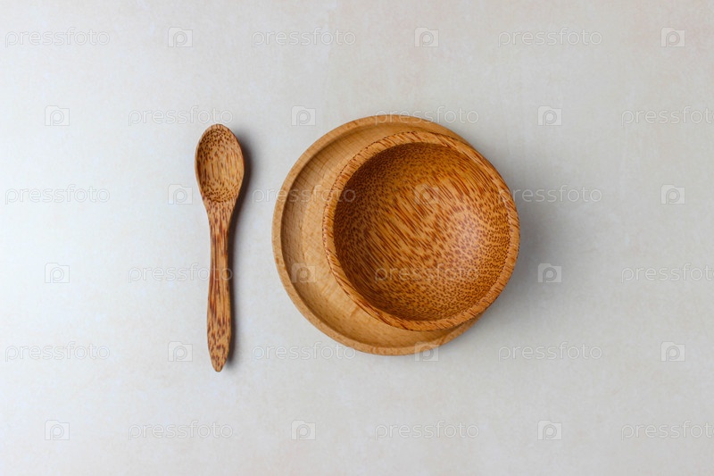 Деревянная посуда на кухонном столе. Круглые деревянные тарелки, деревянная ложка. Концепция подачи, приготовления пищи, деталей интерьера. Вид сверху
