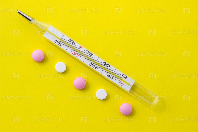 Медицинский термометр и таблетки на желтом фоне с местом для вашего дизайна