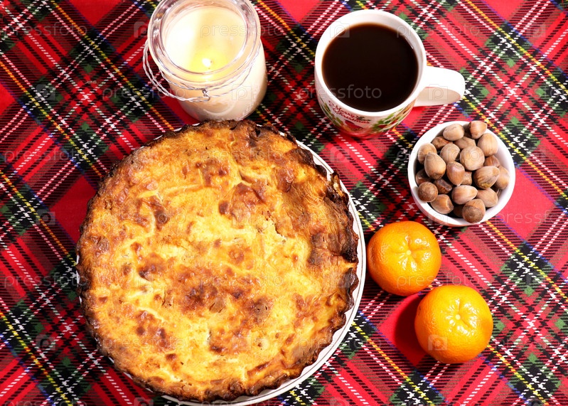 Фото творожной запеканки с чашкой горячего шоколада, свечой, мандаринами и фундуком на клетчатой салфетке вид сверху
