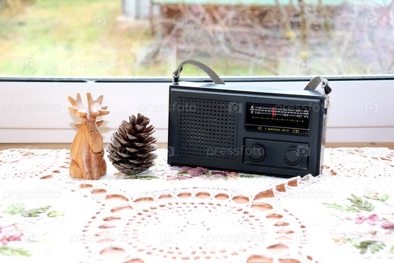 Деревянный лось, конус и старая советская радиола на вязаной салфетке