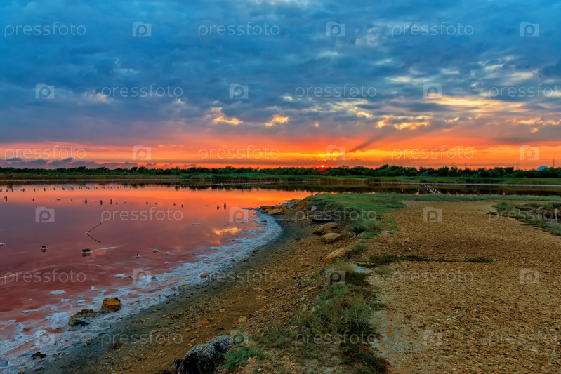 Берег соленого озера в сумерках на закате