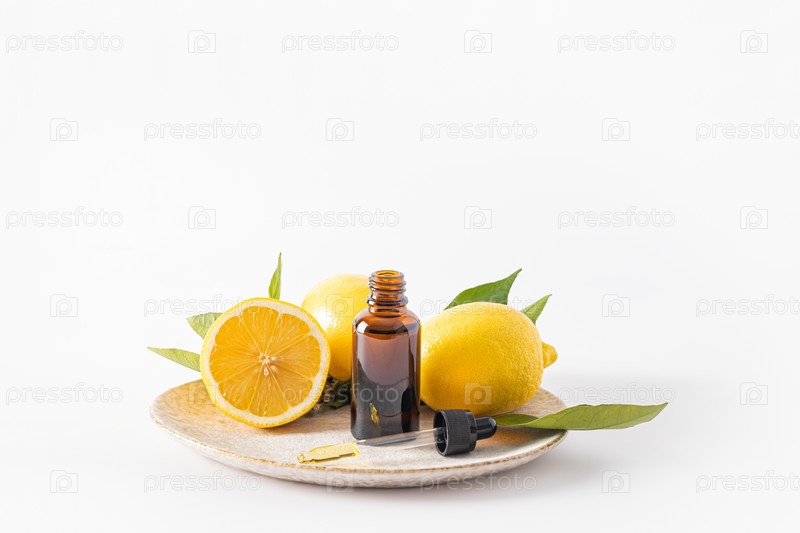 Косметический флакон из темного стекла с органическим лимонным маслом, сыворотка на основе эфирного масла для ухода за кожей лица. растительная косметика