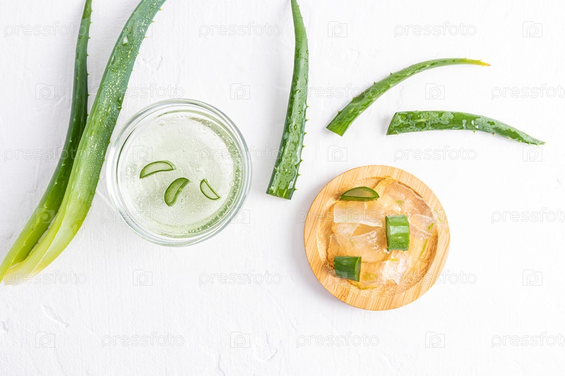 Кусочки прозрачной мякоти листьев алоэ вера в деревянной миске на белом фоне среди сочных листьев растения. натуральный уход за кожей