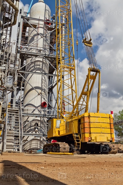 Сборка и установка большого вертикального реактора на нефтеперерабатывающем заводе с помощью мощного гусеничного крана